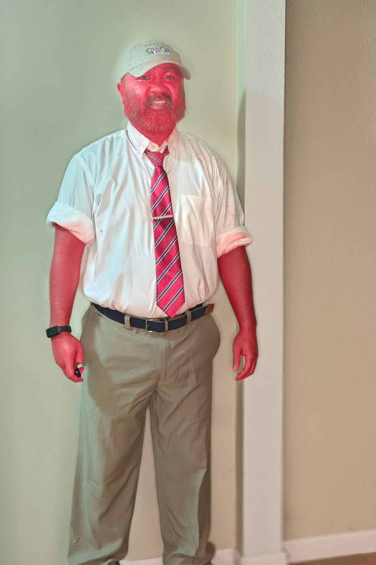 Khakis, a striped tie, and a “holding-it-together” smile are worn with deceptive calm in this low-key but hilarious anger-inspired Halloween costume. The office-worker uniform makes it relatable, while the knowing grin hints that something’s simmering under the surface.