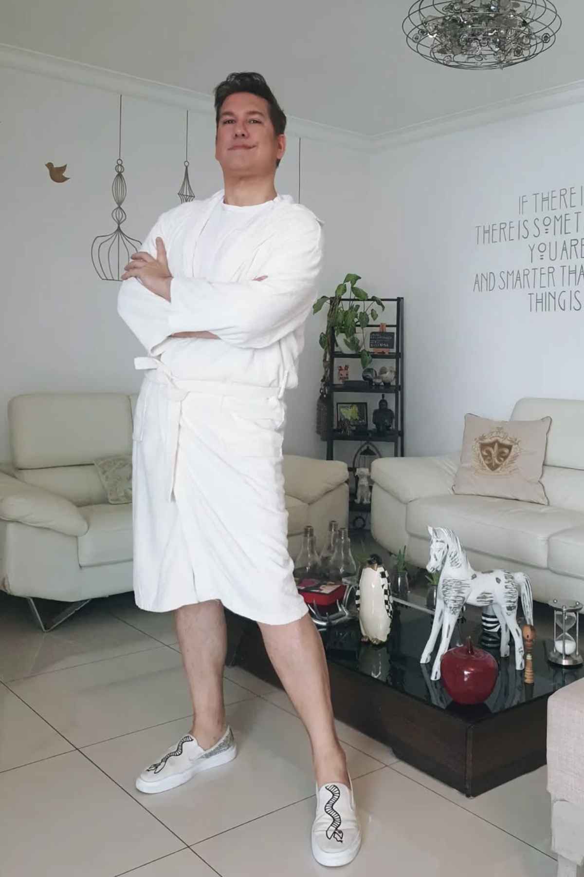 A white bathrobe and snake-print slip-ons are styled with unapologetic confidence, as if a dress code memo was politely ignored. Arms are crossed, stance is unshaken, and not a single ounce of comfort has been sacrificed for style.