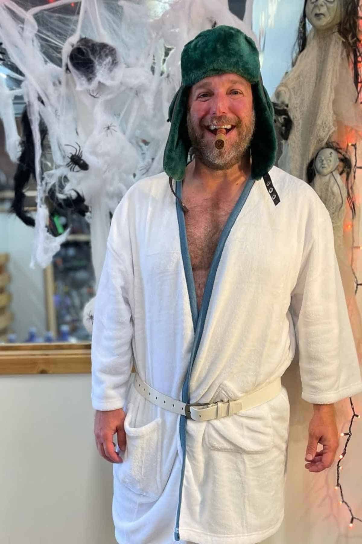 The legendary Cousin Eddie look has been hilariously reimagined for Halloween, and it’s as gloriously awkward as you’d hope. That white bathrobe, topped with a green fur hat, is instantly recognizable—and even more so when paired with a cigar in the mouth. It’s the kind of costume that earns instant laughs without a single prop explanation.
