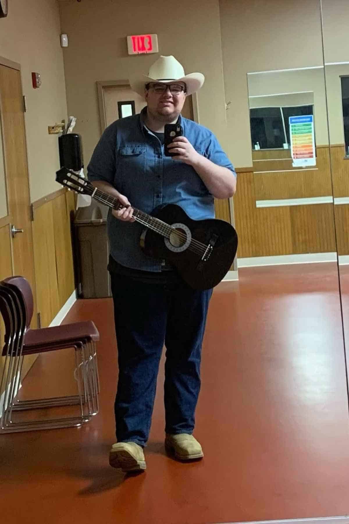 A white cowboy hat and a trusty guitar can turn any room into a country-meets-Halloween showdown. This outfit blends western charm with festive flair, especially if you hum a few ghostly tunes along the way. Blue denim shirt, jeans, and boots keep it simple, while the guitar makes it fun and photo-worthy. The mirror selfie is just the cherry on top—it practically begs for a “Yee-haw, y’all!” caption.