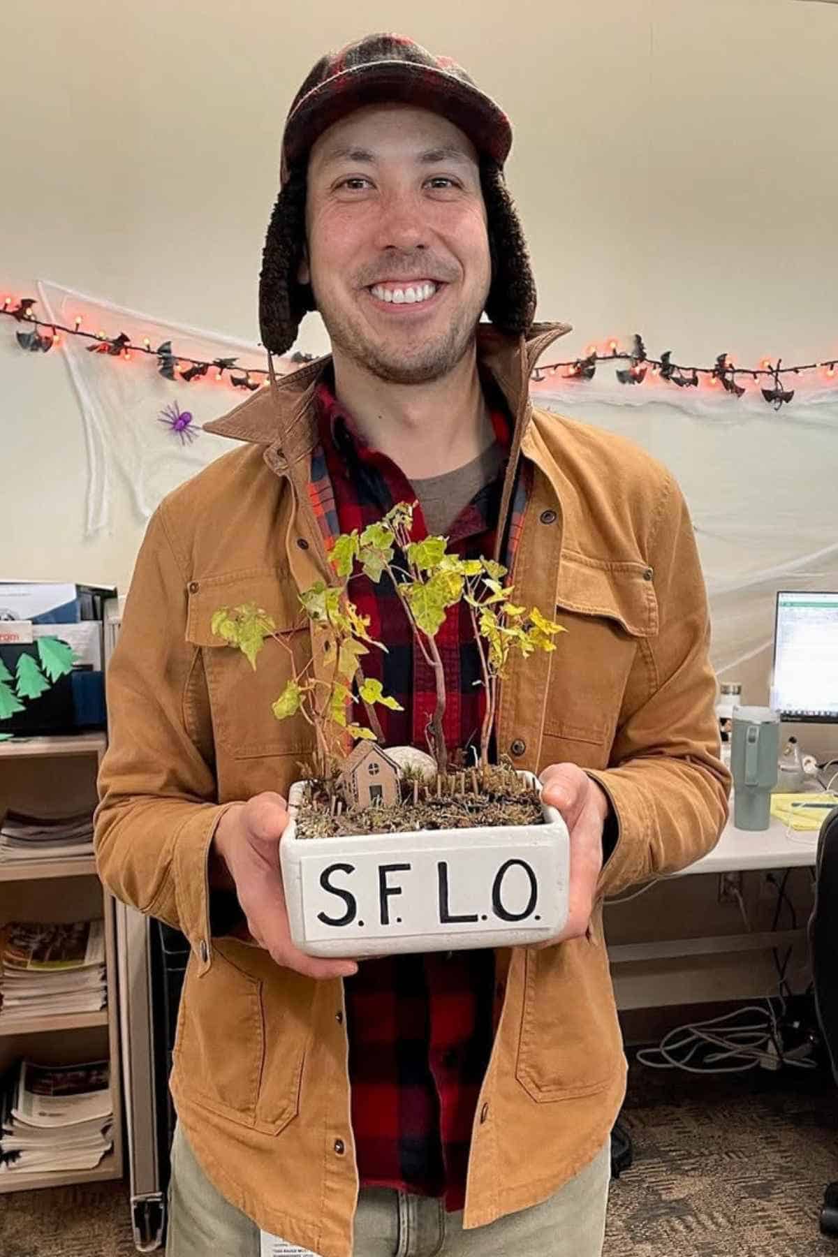 An office plant pun has never looked so good—or so creative. Armed with a planter labeled “S.F.L.O.” (Small Forest Land Owner), this costume is understated yet hilarious. The brown jacket and plaid shirt give it a comfortable, minimalist style, while the Halloween decor in the background sets the festive scene. It’s not spooky—it’s wholesome comedy gold.