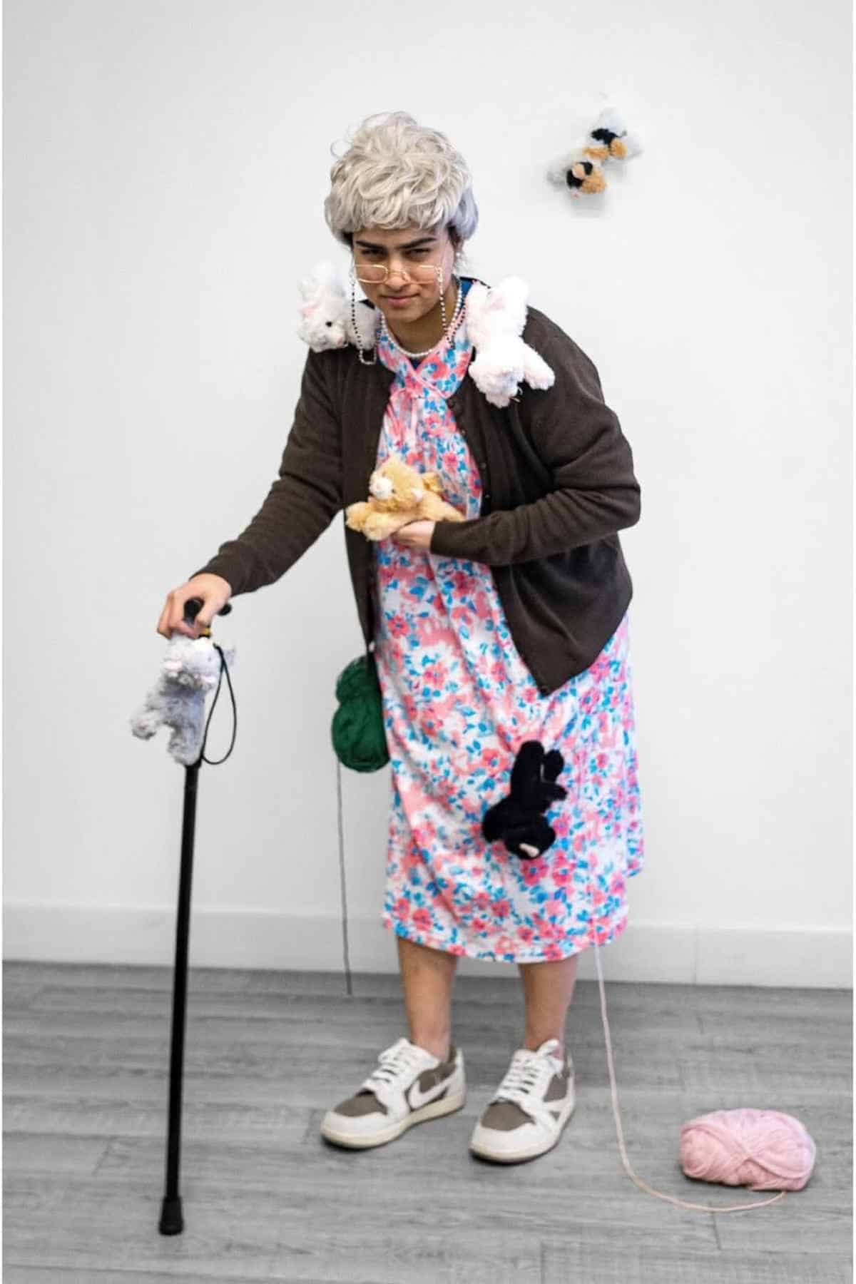 An unexpected twist on Halloween dress-up comes with a funny elderly woman costume that’s as easy as it is hilarious. Oversized glasses, a gray wig, a floral dress, sneakers, yarn, and a cane instantly transport the wearer into their golden years — no time machine required. Stuffed animals pinned to the outfit bring extra charm and a dose of the ridiculous, making this look perfect for festive photo ops.
