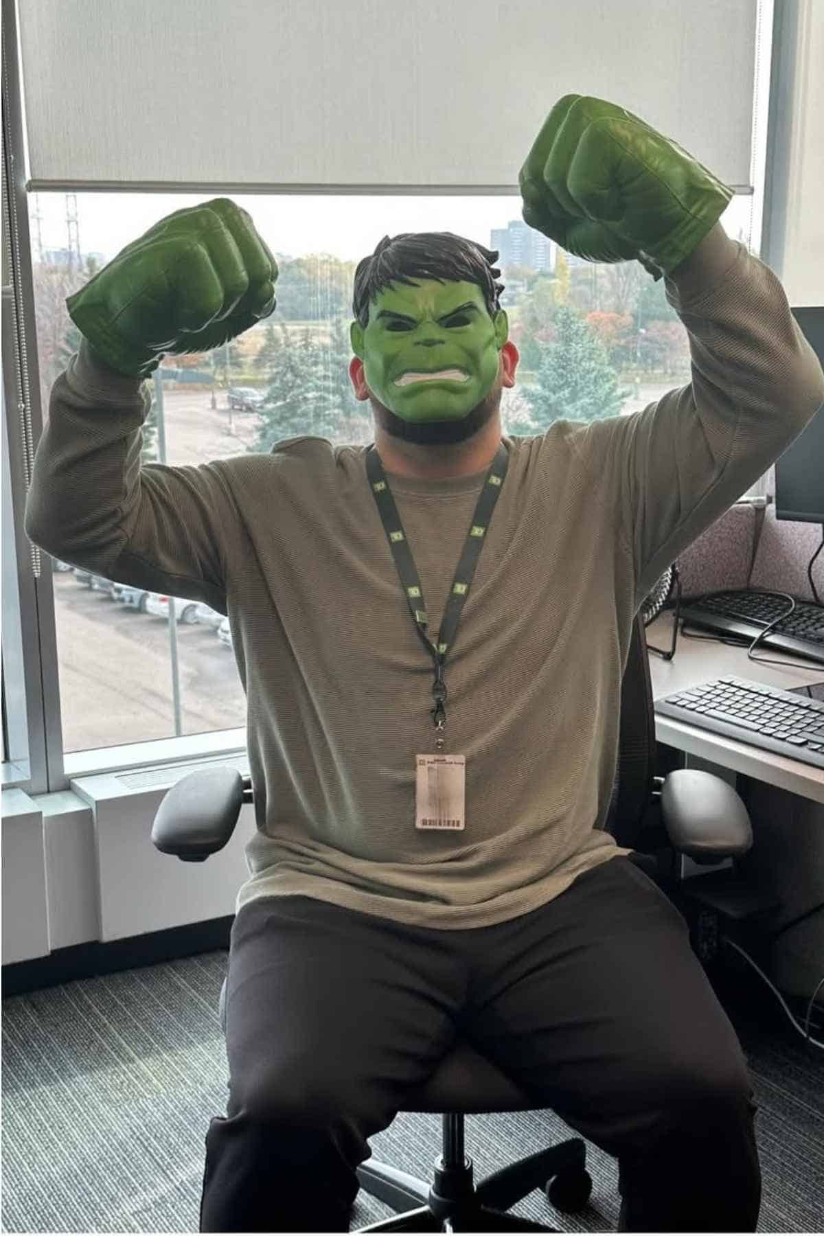 When the green gloves go on and the Hulk mask is pulled into place, even the most boring spreadsheet seems like it could be smashed to pieces. In this fun and festive office look, no real gamma rays are needed—just a chair, a scowl, and the willingness to raise both fists dramatically when the coffee runs out.