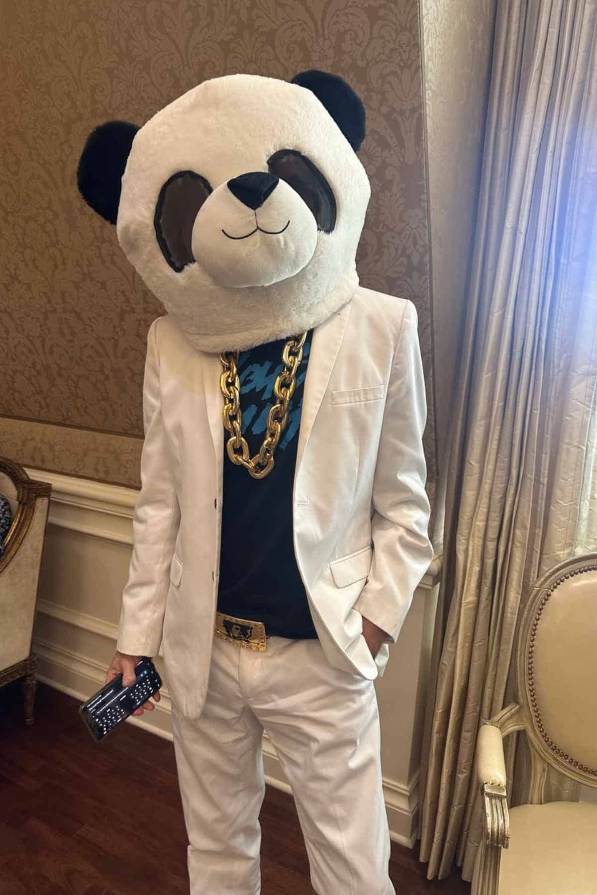Nothing says “ready for a Halloween dance floor” quite like a giant panda head paired with an oversized gold chain. The look is fun, a little festive, and impossible to miss. The white suit and pants combo adds a touch of classy style while still keeping it lighthearted.