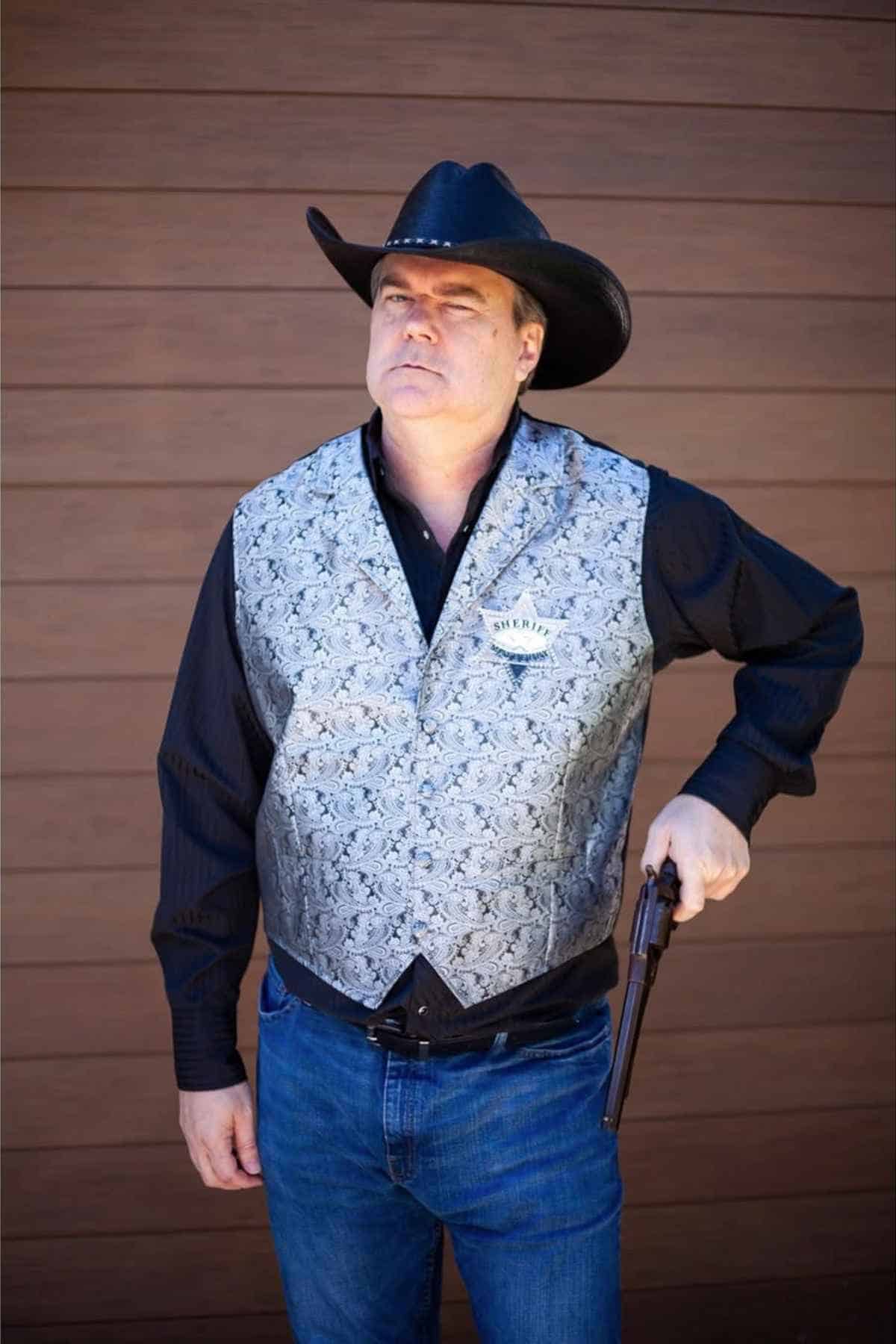 Against a weathered wooden wall, a man stood with quiet authority, revolver in hand and a sheriff’s badge gleaming on his vest. The patterned fabric, paired with a black cowboy hat and jeans, delivered a classy yet festive western feel, with just enough grit to suit a Halloween showdown.