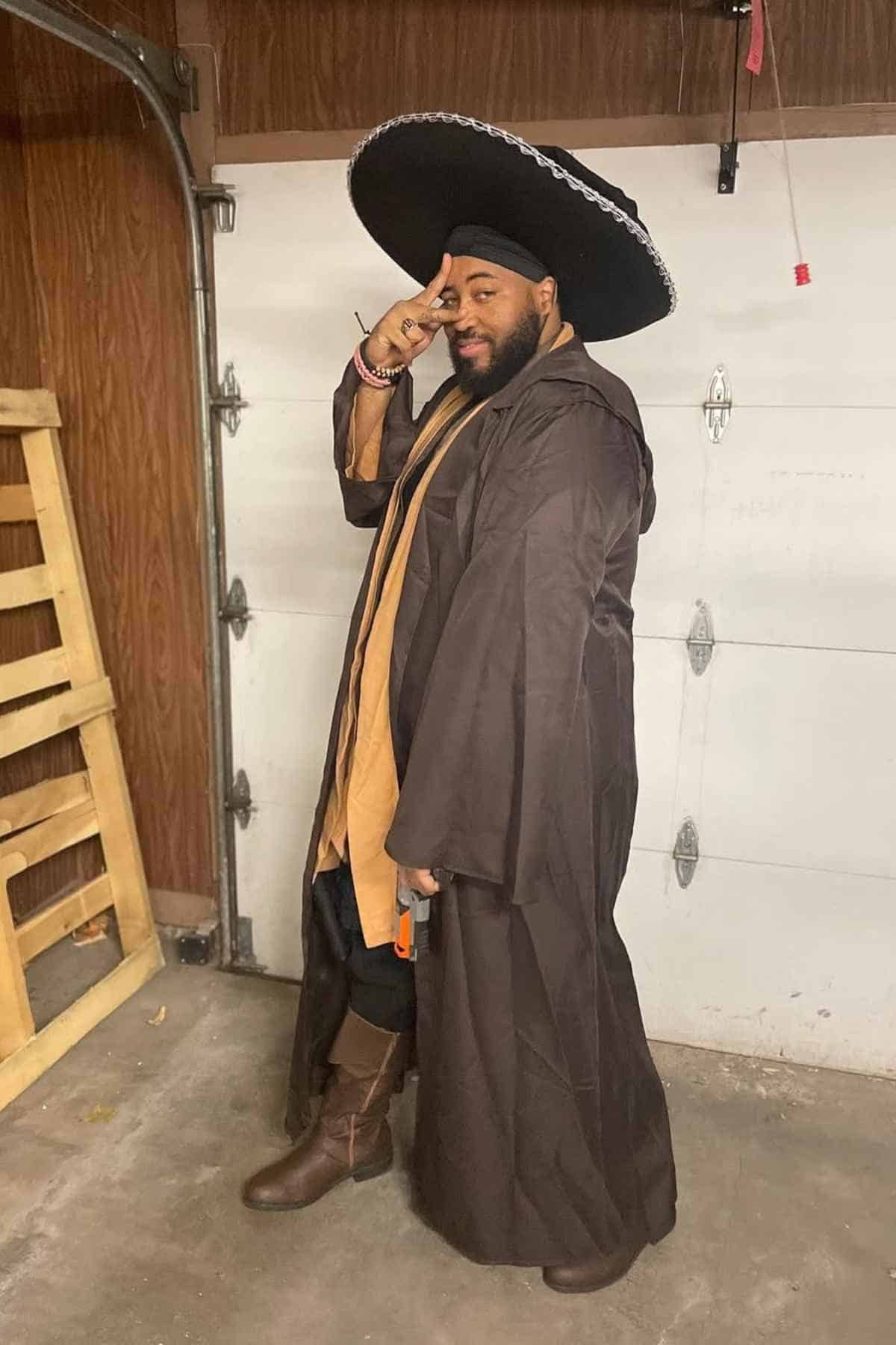 In a garage far from any enchanted forest, a wizard with a flair for the unexpected was spotted making a peace sign. The oversized black sombrero added a playful twist to the traditional robe-and-boots combo, making the whole scene feel like a cross between festive fiesta and mystical gathering.